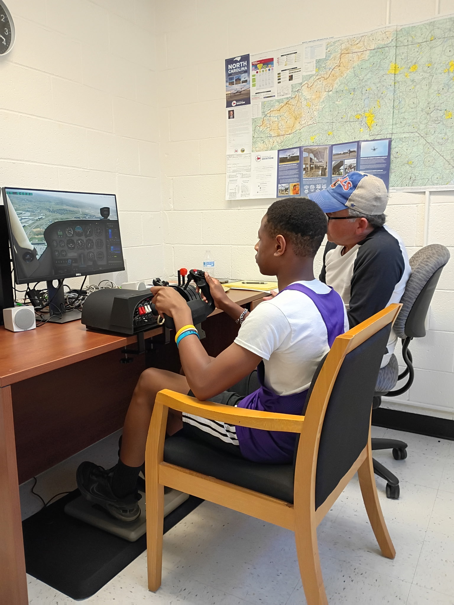 “Lo que distingue a esto de un videojuego es que se trata como un laboratorio de vuelo, haciendo hincapié en los fundamentos reales de la aviación, la concentración y la responsabilidad”, dijo Cimarron Reed, coordinador de actividades recreativas en Durham Teen Zone. “En definitiva, se trata de crear un camino, desde aprender lo básico hasta explorar la formación de pilotos y las carreras en la aviación”.