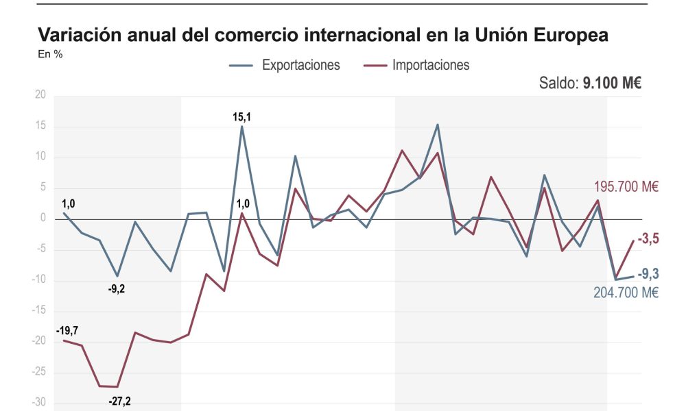 Bruselas, 17 abr (EFE).- El superávit comercial de bienes de la Unión Europea con Estados Unidos cayó más de la mitad (53,4 %) en febrero de...