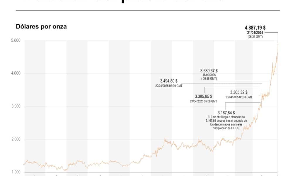 Madrid, 21 ene (EFE).- El precio del oro continúa subiendo y ha logrado un nuevo máximo histórico al aproximarse a los 4.900 dólares, al situarse en...