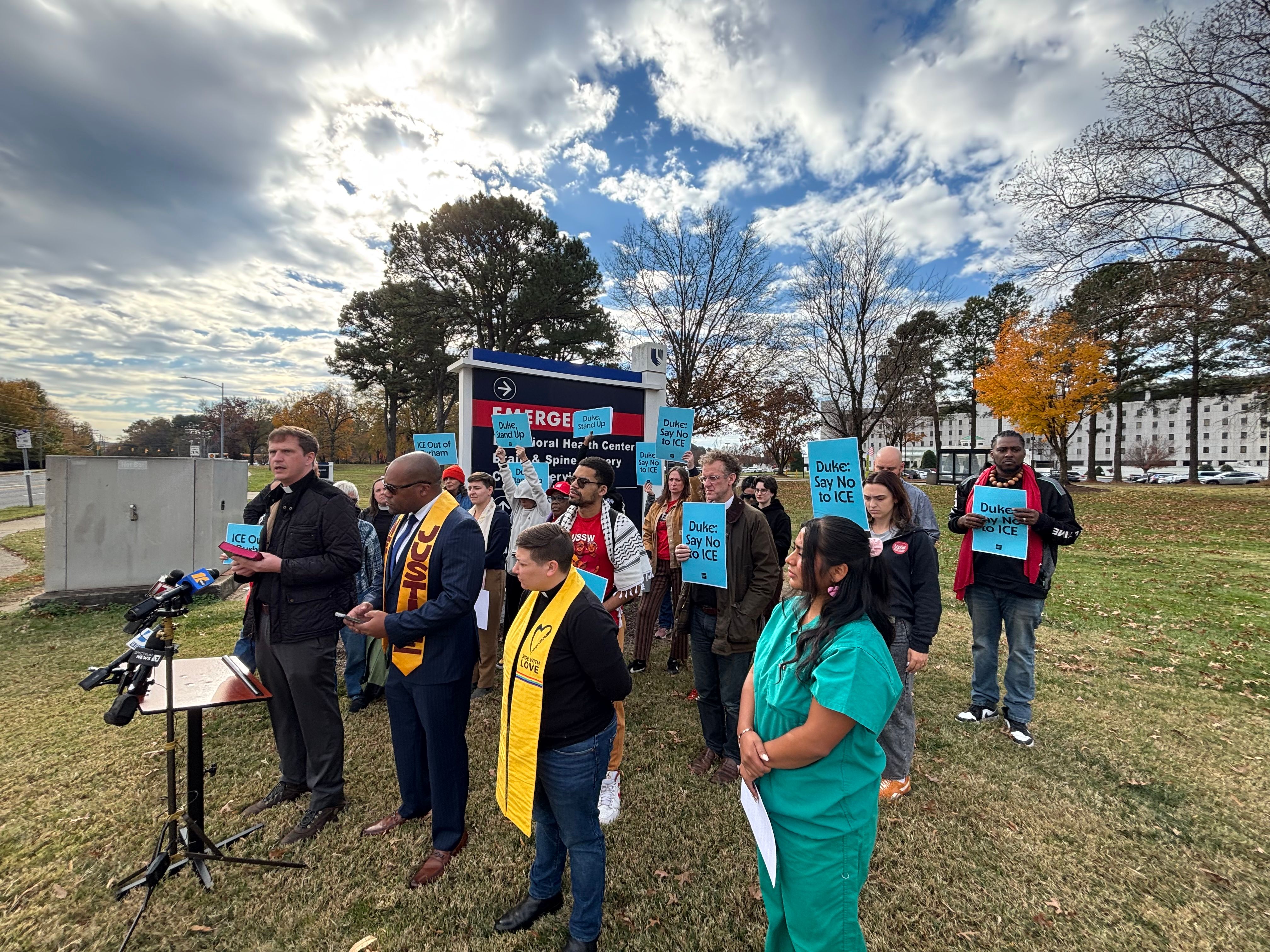 Una coalición de grupos comunitarios de Durham —Durham Rising, la Unión de Estudiantes de Posgrado de Duke, la Asociación de Educadores de Carolina del Norte, la Unión de Trabajadores de Servicios del Sur y Siembra NC— se reunió esta mañana frente al Hospital Regional de Duke. Exigen a la Universidad de Duke y a los demás empleadores e instituciones más importantes de la ciudad que se adhieran al  Compromiso Laboral de la Cuarta Enmienda , que incluye medidas para disuadir los registros e incautaciones inconstitucionales y proteger a su personal y usuarios.  Grupos comunitarios de Durham celebrarán una conferencia de prensa el 19 de noviembre de 2025.