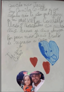 Camila, es la hija de Víctor Castillo, un preso político del estado Portuguesa, en los llanos venezolanos, escribió una conmovedora carta en la que por segundo año consecutivo le pedía al Niño Jesús que su padre estuviese de vuelta en casa.