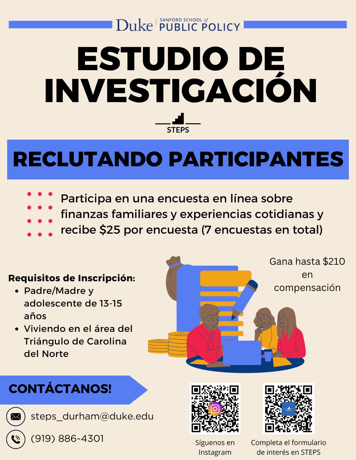 Durham, NC., 14 de octubre de 2025- La Escuela de Políticas Públicas Sanford de la Universidad de Duke está invitando a padres, madres y adolescentes del área del Triángulo de Carolina del Norte a participar en un nuevo estudio de investigación sobre finanzas familiares y experiencias cotidianas.
