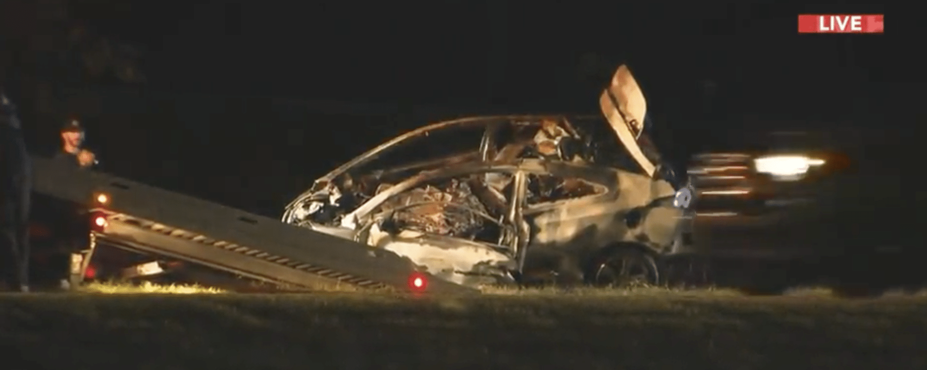 Alrededor de las 6 de la mañana, una grúa retiraba del lugar un coche muy calcinado. El coche se había enredado en un árbol y se había incendiado.